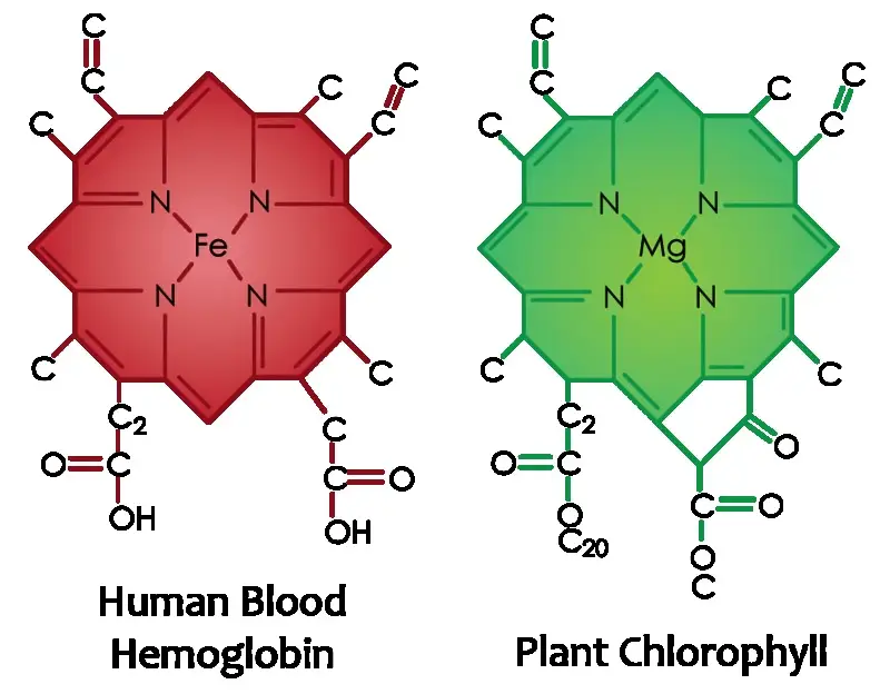 الفرق بينهما ذرة الماغنيسيوم بالكلوروفيل والحديد بالهيموجلوبين.علما ان العنصرين من العناصر الصغرى .